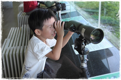 小毛有模有樣的使用望遠鏡觀察鳥類
