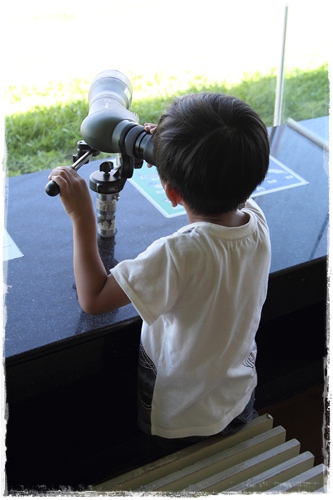 爸比調整好望遠鏡的焦距後讓小毛觀察